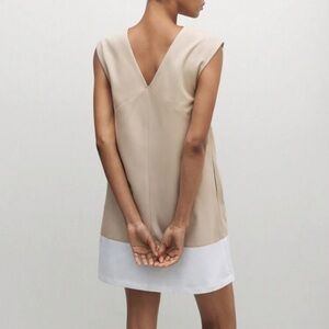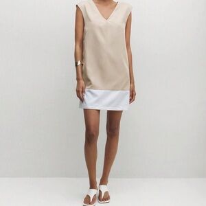 Elegant sleeveless dress in beige and white. Features a V-neck design.
