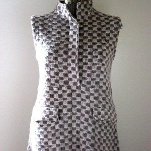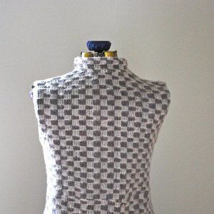 This beige and cream checkered jumper is made of extremely soft and fuzzy fabric and is fastened in the front with hidden buttons down the bust and an empire waist for definition. This dress has pockets in the front and can fit a variety of sizes depending on the fit you desire.