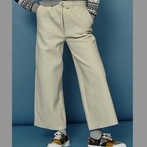 Beige cream felt wool blend high waist wide leg pants new with tags. Loose relaxed style, wide elastic waist with drawstring at the front, side pockets, wide leg, could be cropped, depending on your height. Poly, rayon and wool blend, fabric feels very luxurious, warm and thick. Marked size S. All measurements are approximate and taken with the garment laying flat: Waist 14" (it stretches up to 17’’-18’’) Front rise 13’’ Inseam 26" This item comes from a smoke free, pets friendly home. Recycled bags/box used when possible. Please, let me know if you'd like any additional pictures and/or measurements or other info. Thanks for watching!