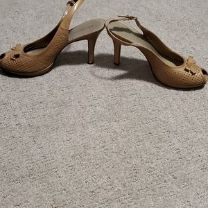 Only worn a few times, I work from home now, so no need. Comfort, peep toe, kind of gold/beige color. Minor scuffs but not visible when worn.
