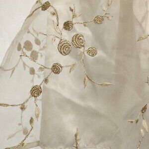 Bonnie Jean Girls Dress for Toddlers in Beige With light antique golden accents. Floral Motif. Has ribbon Waist. Zipper & Button closure at back. Fully Lined & has a ruffle of tulle at bottom inside layer for volume. Nylon & Polyester & metallic fabric. Size 3T. 11 inches pit to pit aprox. 25 inches shoulder to hem aprox. Scoop neckline. Great to excellent preloved condtion. Great for many formal and semi formal events, overall lovely dress.