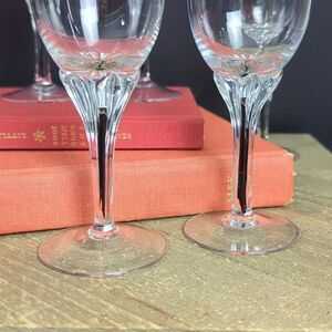 beautiful belfair exquisite set of six liqueur Porto or shot glasses. these have the black ribbed stem set of six. one glass has a small chip on rim but it isn't a sharp chip. these are 5.5 in tall.