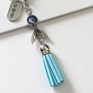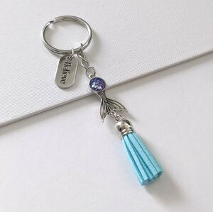 The keychain includes a silver plated tag with the word "believe" engraved on it. It also has a mermaid tail bead, and is finished off with a baby blue suede tassel.