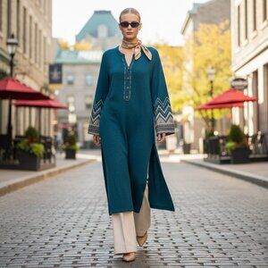 Bring effortless elegance to your wardrobe with this ethnic-inspired knit tunic dress in a stunning teal (deep turquoise/sea green) shade. Made from dense, high-quality knit fabric with a subtle metallic thread (lurex), this piece has a refined texture and drape.