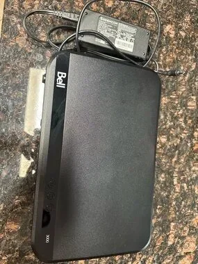 Bell-branded 3000 modem/router in black. Includes matching power adapter. Compact, modern design. Ready to integrate into your home network.