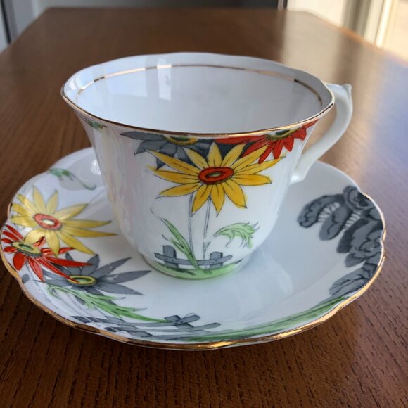 This Bell China, Art Deco, Teacup & Saucer was made in England between 1930-1940. All pieces are hand painted and in excellent condition with no chips or cracks. This rare hand-painted find does have skip in the glaze which would have occurred before firing making it a very unique piece. Please see the last photo for the detail on the gray flower petal.