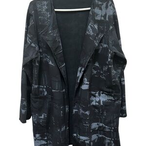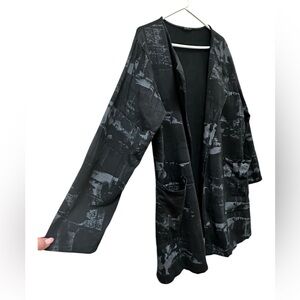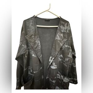 Bella Amore open-front cardigan with a grey abstract pattern. Made in Italy and is 100% cotton. The cardigan has long sleeves, two front pockets, and a lapel-like design at the front opening. The size is Small/Medium and is oversized fits more like a Large/Extra Large. The garment is in excellent pre owned condition and has hardly been worn.