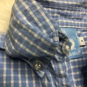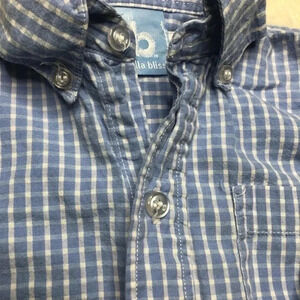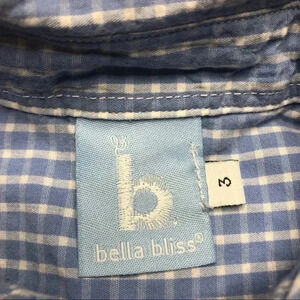 Size 3T button-down shirt Brand is Bella Bliss. Long sleeved Collared Front pocket Blue and white checkered pattern In great, used shape No stains or flaws