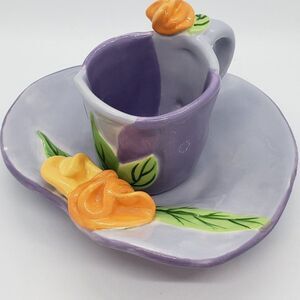 Bella Casa by Ganz Signed Susan Paley Purple Orange Flower Ceramic Cup & Saucer