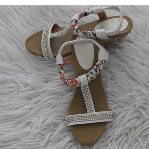 White sandal with t-strap in fabric multi coloured and rhinestones, wedge heel.