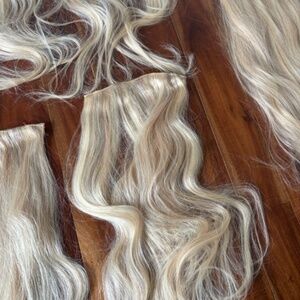 Bellamy hair extensions. Honestly so nice, and soft. Clips are all intact. Worn maybe 3 times. My hair is very thick and curly now and I bought these extensions a while ago when my hair was very damaged and short. Been kept in their bag. Got them layered and cut a bit.