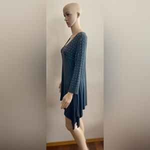Grey Mini Dress with Silver Gems across the Yolk and down the Sleeves. Asymmetrical Hem