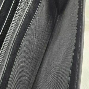 Crafted of leather with a glossy patent finish. It features a front flap and an interior slip pocket.