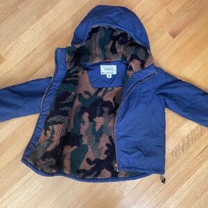 Excellent used condition Bellerose water repellent hooded jacket, dark blue exterior, camouflage teddy sherpa inside