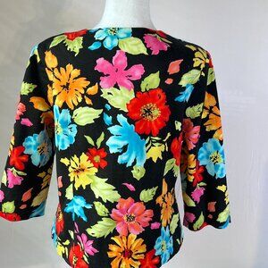 Unleash your inner fashionista with this Bellessa vibrant floral print jacket! Against a sleek black background, the bold, colorful florals make an edgy, avant-garde statement, perfect for someone who dares to stand out. This size 16 jacket features a chic crew/round neck, practical zip closure, and stylish 3/4 sleeves, making it ideal for layering. Whether you're aiming for a funky retro vibe, a touch of Y2K nostalgia, or a truly eye-catching, glamorous look, this piece delivers. It's more than just a jacket—it's a wearable piece of art that promises to be a conversation starter at any event.