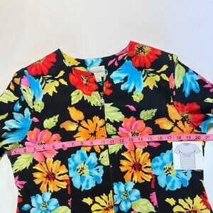 Unleash your inner fashionista with this Bellessa vibrant floral print jacket! Against a sleek black background, the bold, colorful florals make an edgy, avant-garde statement, perfect for someone who dares to stand out. This size 16 jacket features a chic crew/round neck, practical zip closure, and stylish 3/4 sleeves, making it ideal for layering. Whether you're aiming for a funky retro vibe, a touch of Y2K nostalgia, or a truly eye-catching, glamorous look, this piece delivers. It's more than just a jacket—it's a wearable piece of art that promises to be a conversation starter at any event.