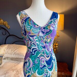 Bellissima vintage late 90s/early 00s multicolour swirl pattern beaded chiffon dress, size 6. Sleeveless, v neck, mermaid style skirt and hem, clear beads throughout. Purple, teal, tan, navy blue, cornflower, and cream. Fabric has a nice amount of stretch and dress is lined. Bust measures 17.25 inches laying flat, waist 14 inches flat, hips 19.5 inches flat, length is max 53.5 inches from shoulder to hem but has shorter parts of about 48 inches. Cat friendly, nonsmoking home.