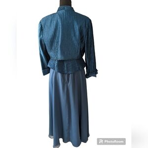 Bellissima two piece formal dress set. dress is full length with short cropped jacket. beautiful diagonal pattern on thejacet and bodice of dress with sequins placed on trim. fully lined, the shirt is a sheer material