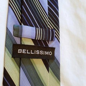 Bellissimo tie with blue, green, and black diagonal stripes. 100% silk. about 3.5" at it's widest point.
