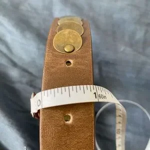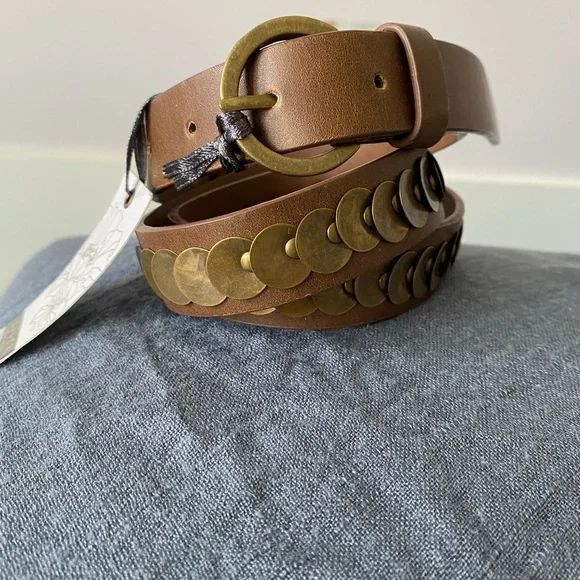Brown, vegan leather belt with coin-like details. New with tag, 1’’ width.