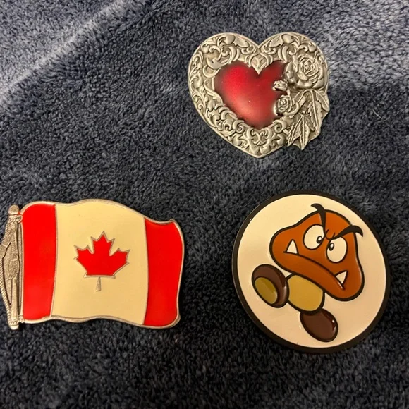 Set of three belt buckles, one Canadian Flag, one heart with roses, and one Goomba.