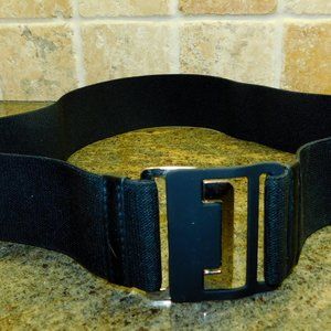 Two are black with silver trim. One is a silver bow type design. The other is a decorative center of the belt. The third is beige/black that stretches. The fourth is black/grey that stretches. The last is solid black with silver buckle