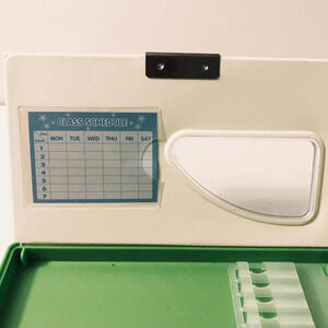 This pencil case is pre-owned and in used condition. It has some sticker residue and marks and wear on it. Please see all photos for exact item.