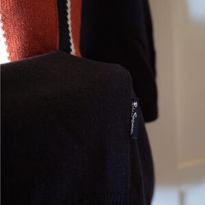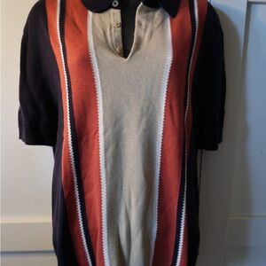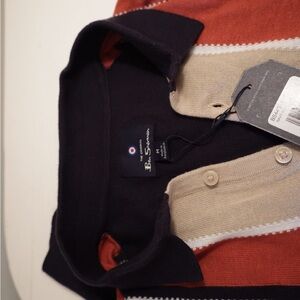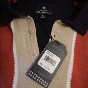 Ben Sherman polo with bold orange and beige stripes, navy. Lovely colour combo . Classic collar and button detail.
