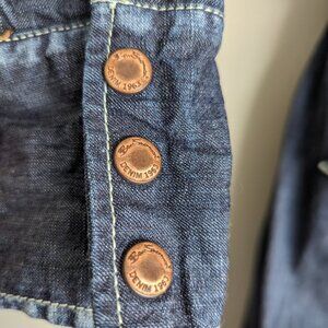 'Tint Paint dress' is the description of this dress. Intentional bleach effect wash on the trima, around the cuffs, pockets and bottom on the contrast of dark denim. The dress gives a modern western vibe, with an accented seam above shoulder blades. Snap buttons on sides, at bottom of skirt hem,.