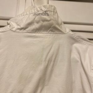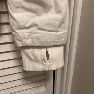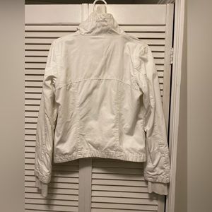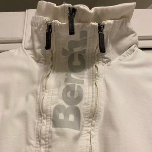 White bench coat double zipper and a third is a half zipper with thumb holes and pockets.