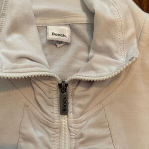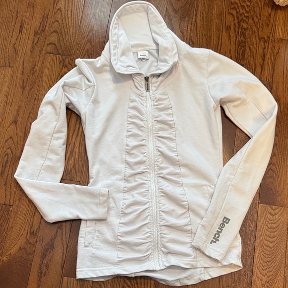 Elegant cream jacket with ruffle accents. Features a high collar and full zip closure. Ideal for casual outings.