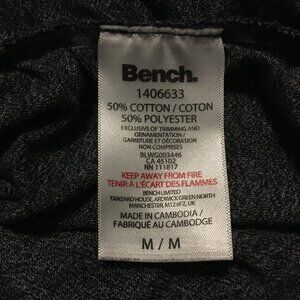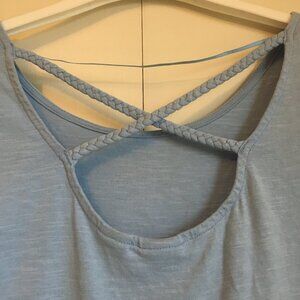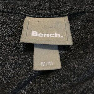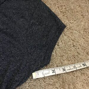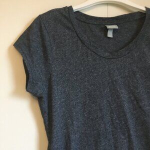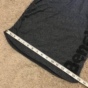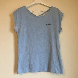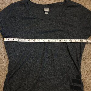 Very good preowned condition heathered dark charcoal grey, crewneck, ruched-side, workout t-shirt by Bench. Includes a free light blue, braided crossback t-shirt as well. The blue shirt has some wear and a small stain at the front and so has been included as a freebee. But otherwise, has plenty of life left in it yet.