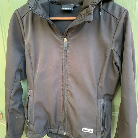 Black Bench jacket. Draw string waist, inside pockets, hood, zipped outside pockets.