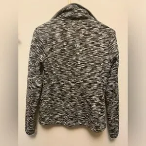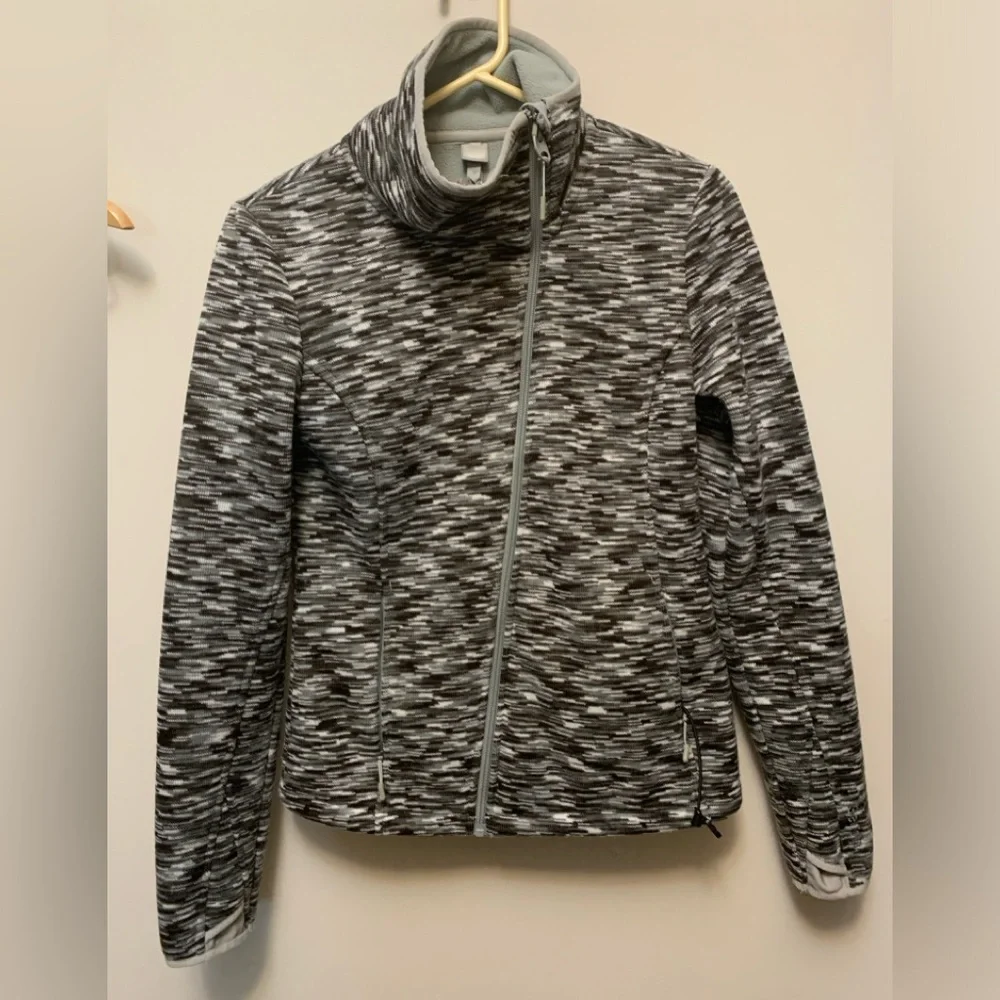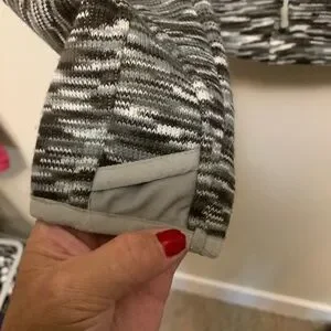 Outside is a different material. Its texture and heavier than a sweater would be. Has thumb holes and a strap for your gloves. Fleece lined.