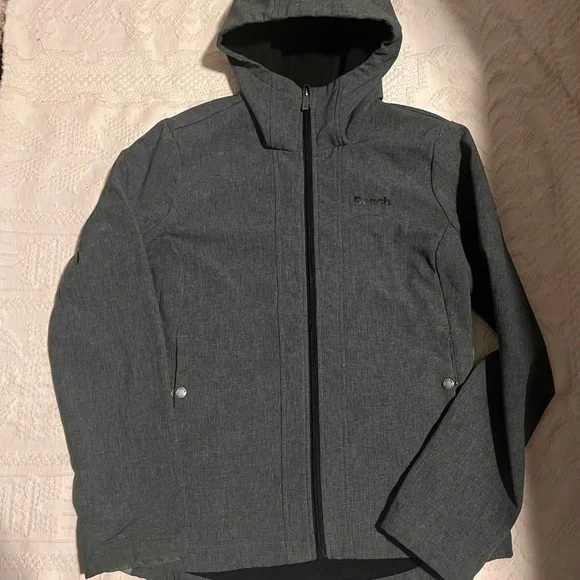 Experience comfort and style with the Bench charcoal jacket. Features a hood and sleek design with fleece lining. Ideal for outdoor activities. In excellent condition. This is a very flattering jacket.