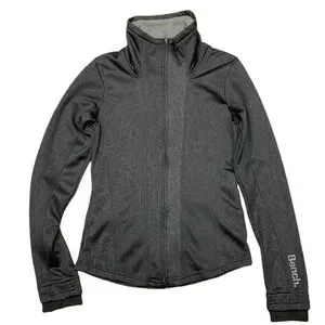 Long sleeve with thumb cut outs zip up black BENCH Jacket. 2 outer pockets.