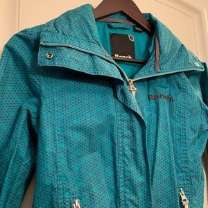 Blue thick nylon jacket from Bench. This jacket has a retractable hood, which is perfect for the rain or cooler weather. Lightly worn.
