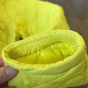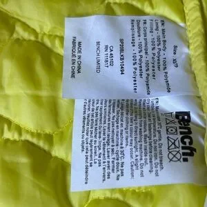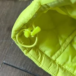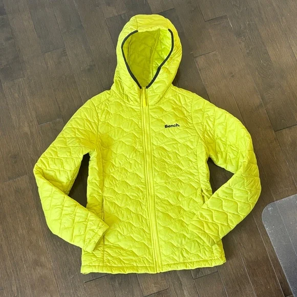 Vibrant neon yellow jacket by Bench. Quilted design with a cozy hood. Perfect for chilly days.