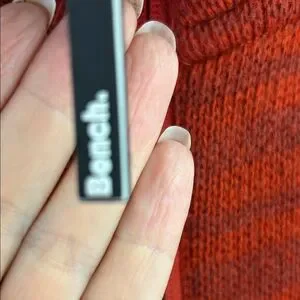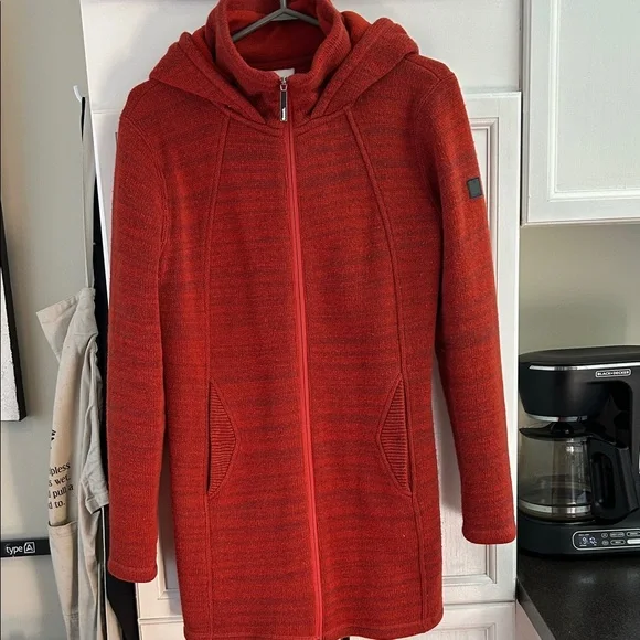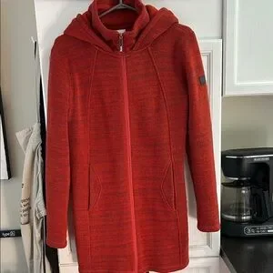 Cozy rust (red/orange) jacket with hood. Full zip front. Ideal for casual wear.