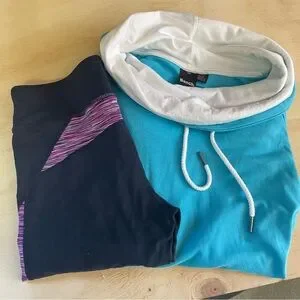 Both size small Navy blue and purple leggings Sky blue top with cowl neck