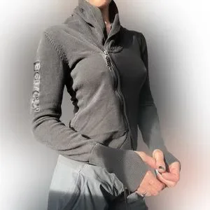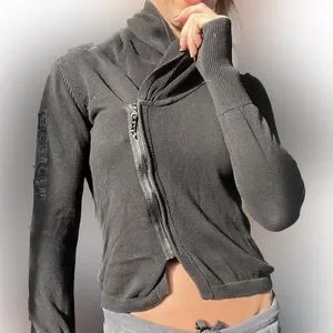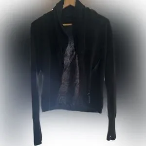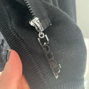 A very unique asymmetrical black Bench sweater. Absolutely love the neckline. Long sleeves with loop holes for the thumbs. Bench emblem down the side of one of the arms. Great condition other than a little wear on the bench logo on zipper (as shown in pic)
