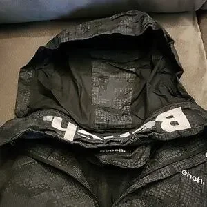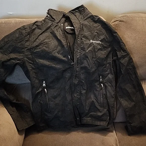 I have a gently used Bench jacket for spring and fall... its wind and water proof and has a hideaway hood... very lightweight could be good for a run on a brisk morning.... It's black and gray with big zipper pockets even a small button up pocket on the one sleeve.. theres no stains or holes anywhere
