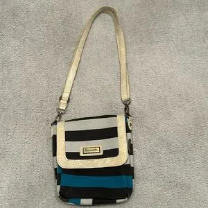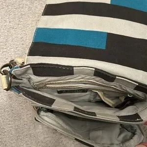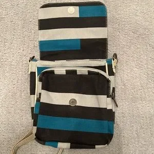 Bench purse. New, never used. Adjustable strap. Measures 8”x8” with zippered compartment, and inner compartment with zippered pocket and cell phone holder. Denim material