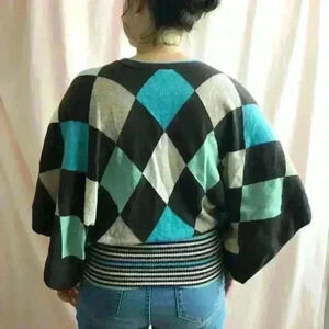 This is a kimono sleeve top with a V neck in a bold rhomboid pattern in blue-brown- tan colour combination. It has a wide striped ribbed waist bend. Soft wool blend fabric 80% wool 20% poliamid. Indicated S, but it is a loose-fit style and stretchable, M fits well like in photos.