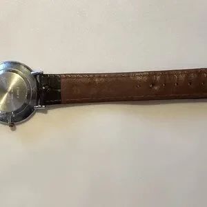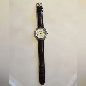 Elegant watch featuring a brown leather strap and a white dial with rhinestones around the dial . Perfect for any occasion. Genuine leather . In good condition, may need a new battery . Unisex