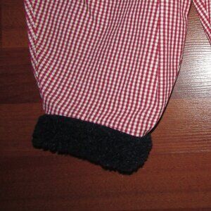 Pants are denim red and white check with blue berber bottom hem, and coordinating white and blue star topped back pockets.