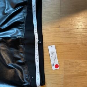 Featuring stretch faux leather in front and stretch knit in back, they offer a unique blend of edgy look and ease of wear. The design shapes the leg and thigh, creating a sleek silhouette. Versatile enough to pair with sweaters, jackets, and tops, these leggings complement a wide range of outfits. From casual days to special occasions, they're a flexible piece for your wardrobe.