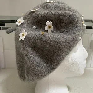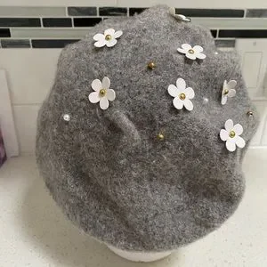 Cute Heather grey beret with pretty daisies & pearls sewn on one side. Fits a size Small. Gently used condition.