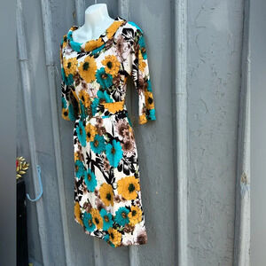 Beautiful floral belted dress from Toronto designer Bergstrom Original’s. Has a lovely retro silhouette to it. No materials tag but made with a stretch jersey.