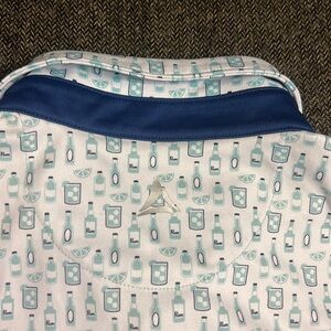 This blue and white casual polo shirt features a subtle fun pattern with liquor and beer bottles and cocktail glasses with fruit slices. The contrasting dark collar and placket enhance its modern appeal, making it a versatile choice for any casual outing or fun in the golf course.
